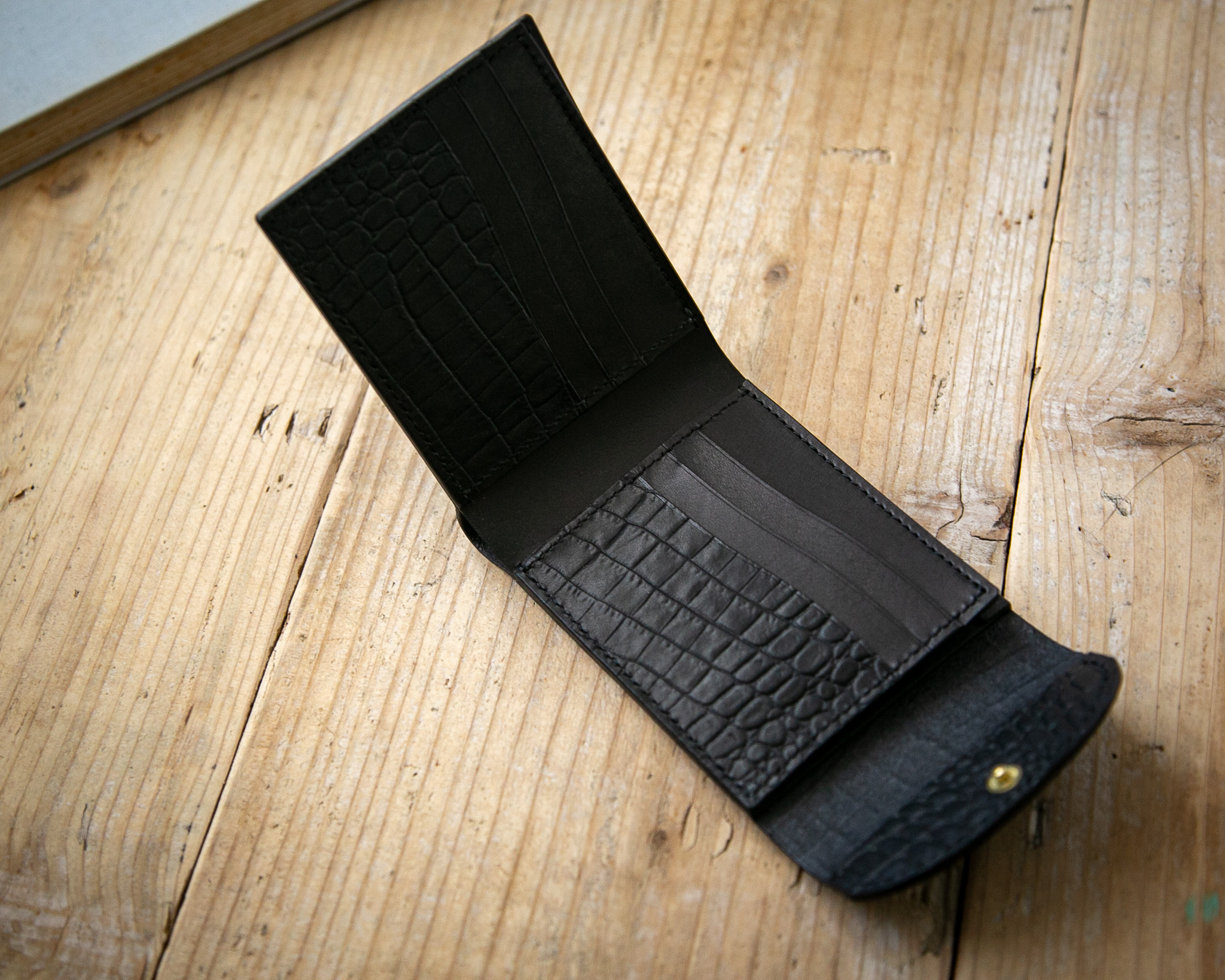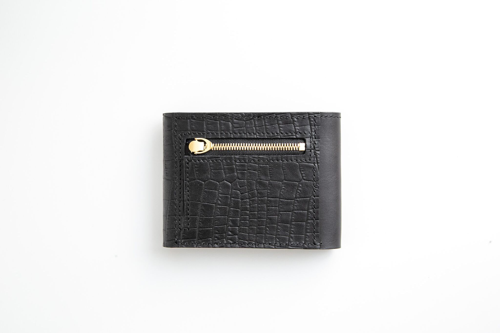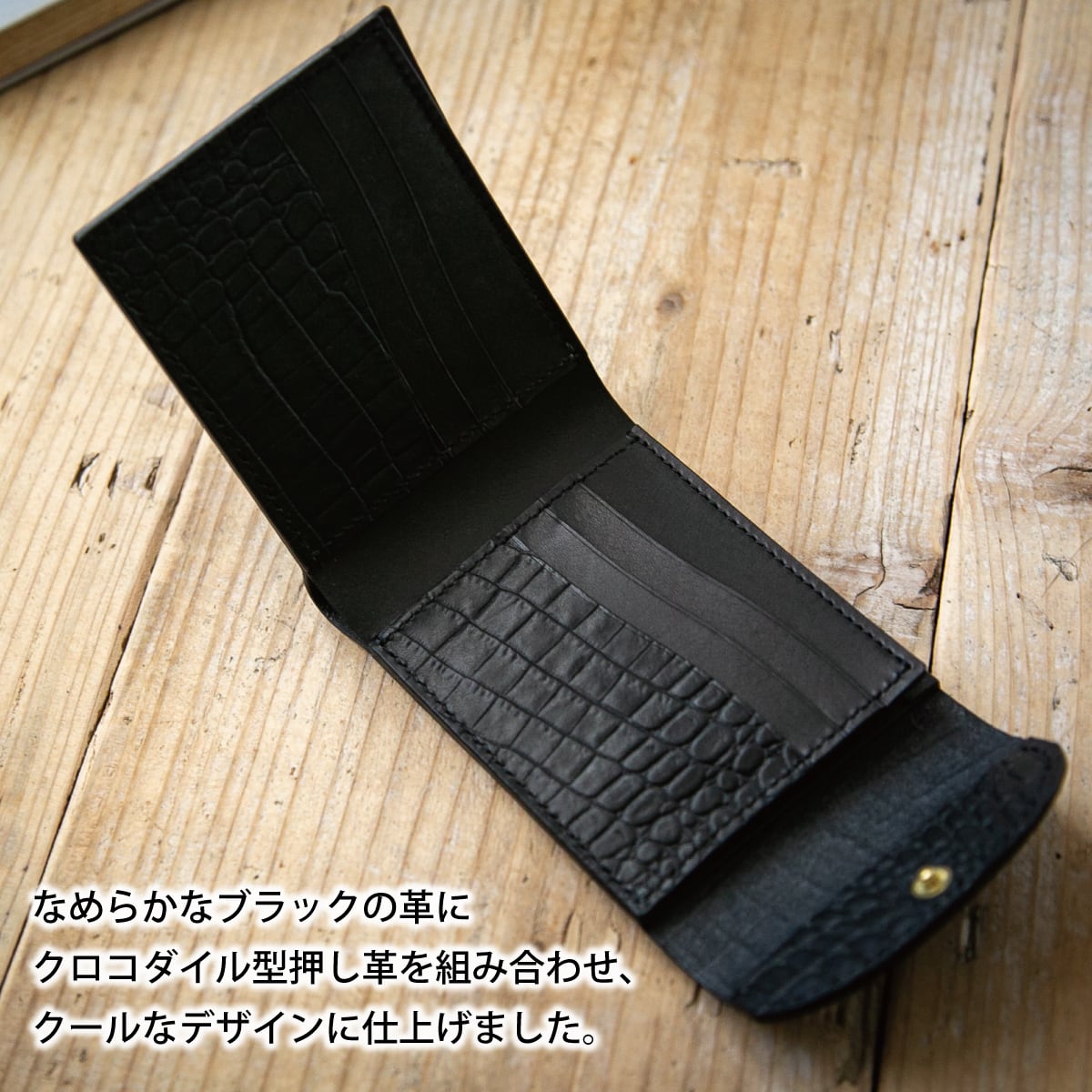 クロコダイル型押しレザーを組み合わせた、フラップ付きの2つ折り財布。