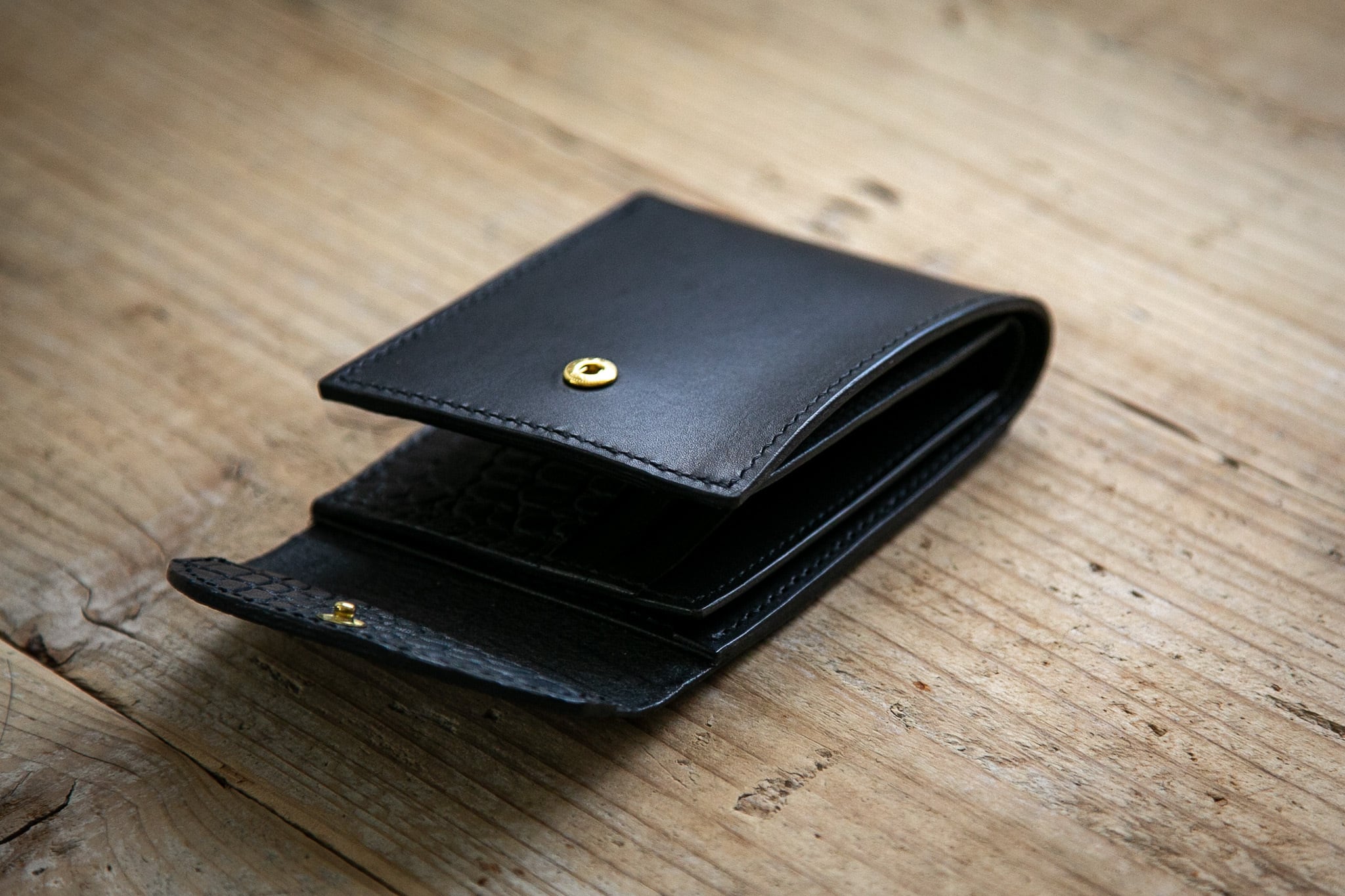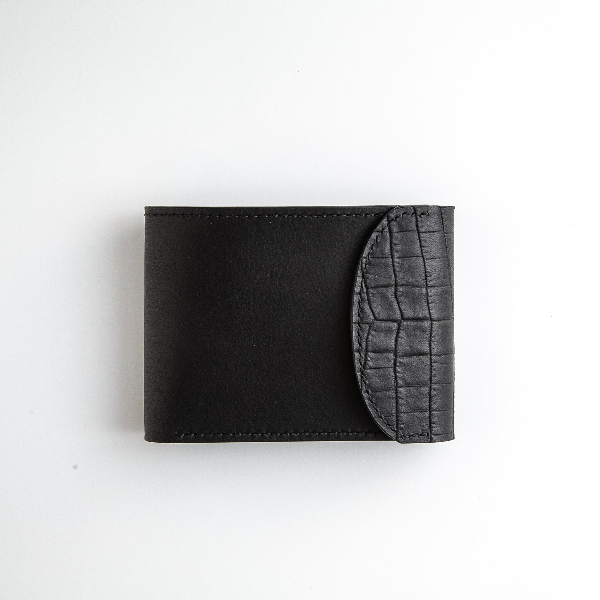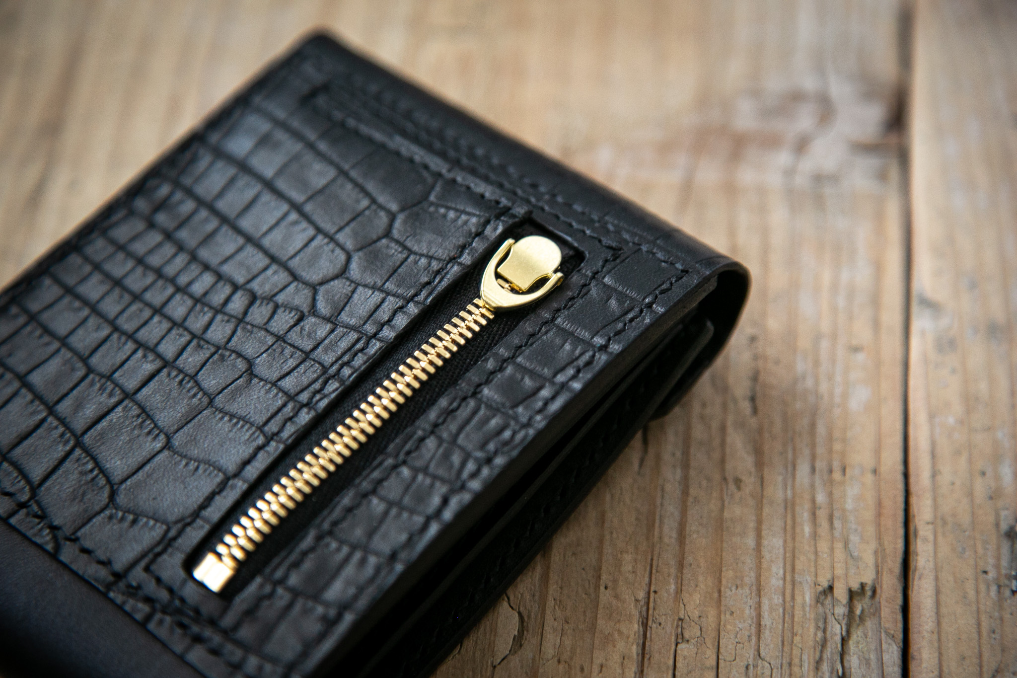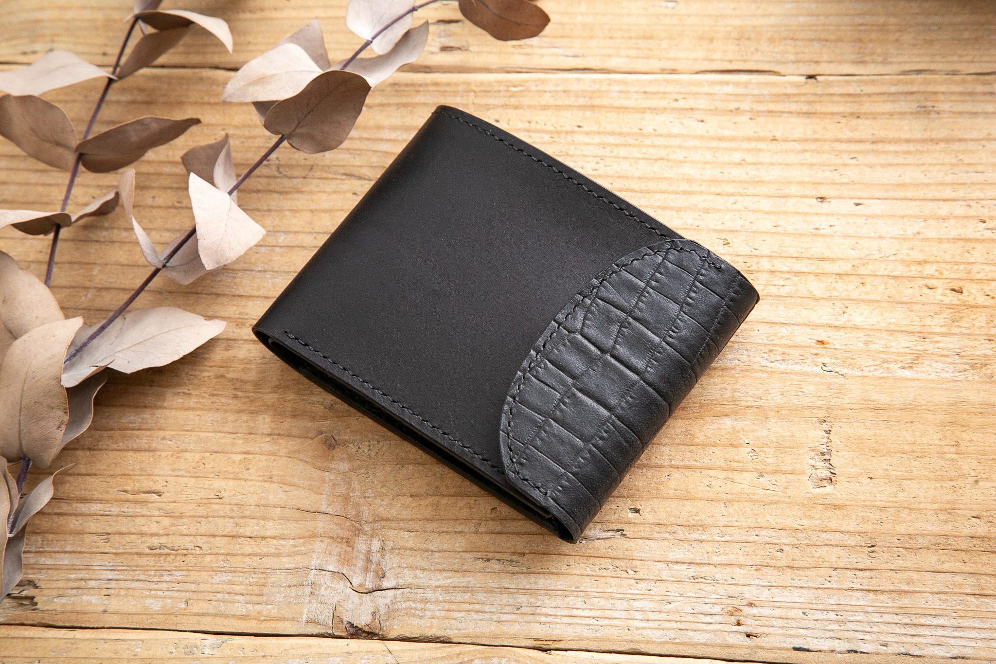 クロコダイル型押しレザーを組み合わせた、フラップ付きの2つ折り財布。