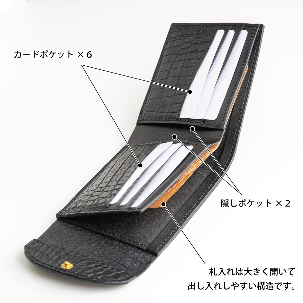 フラップ付きなので使い勝手も安定感があり、札入れが大きく開くため出し入れがしやすいです。