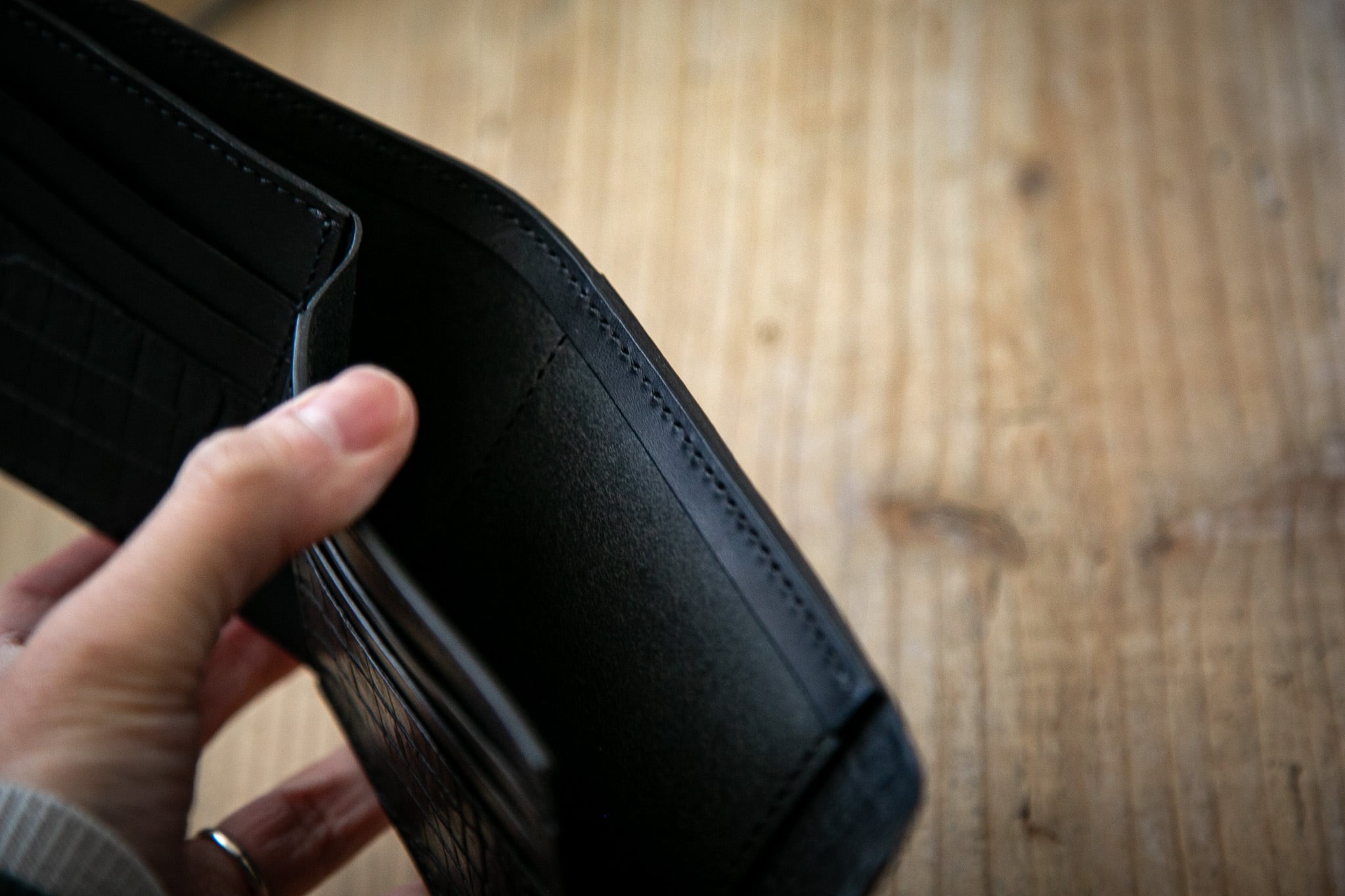 札入れが大きく開くため出し入れがしやすいです。