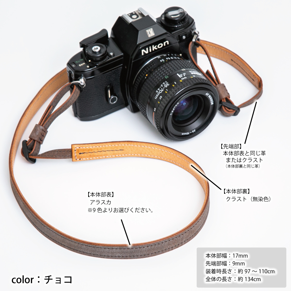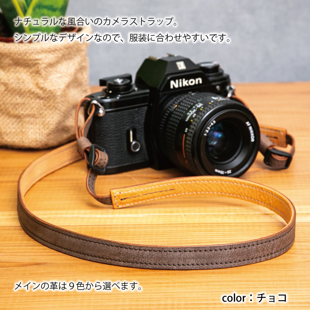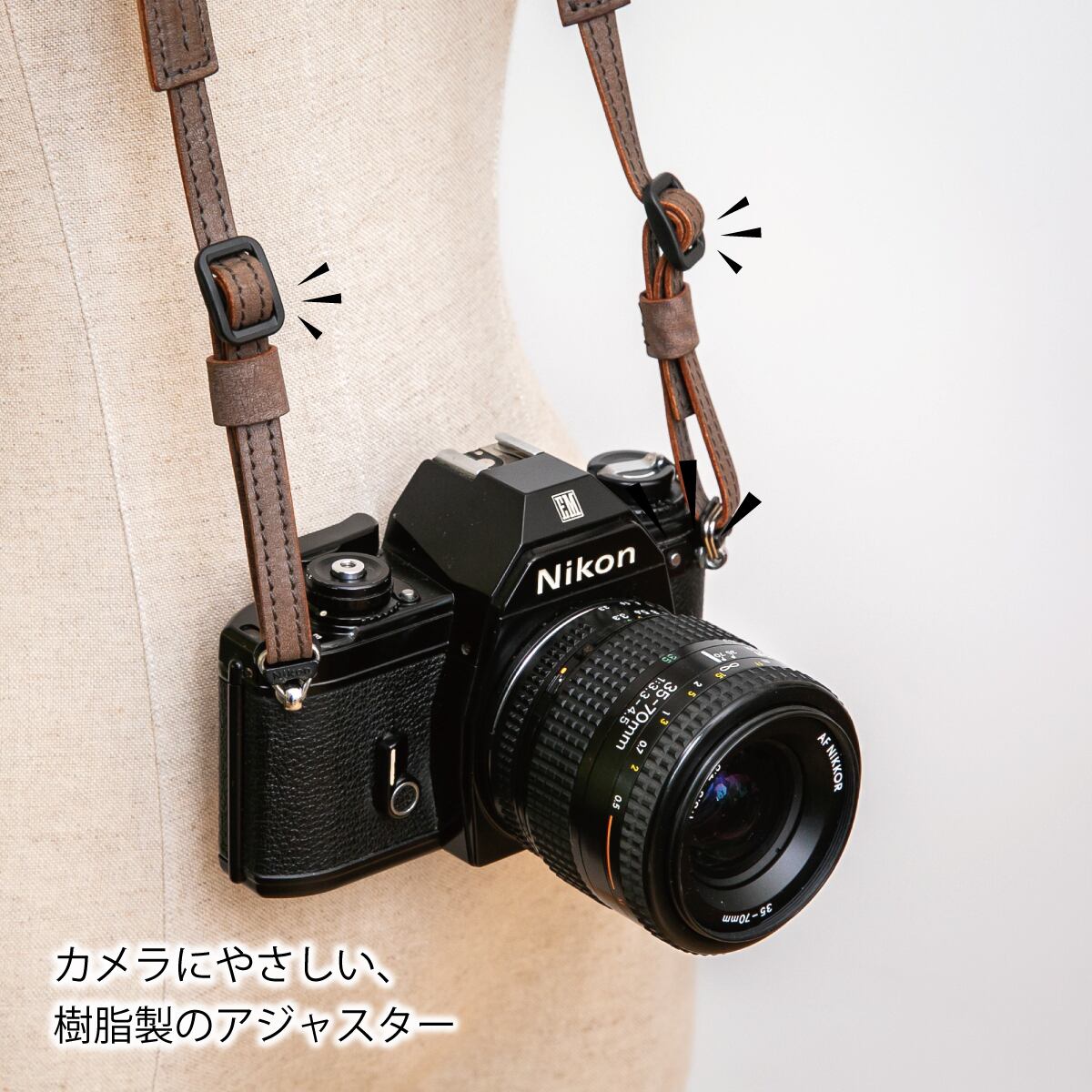 イタリアンレザーを使用し、金具不使用、柔らかくて丈夫な『カメラと撮影者にやさしい』ストラップです。