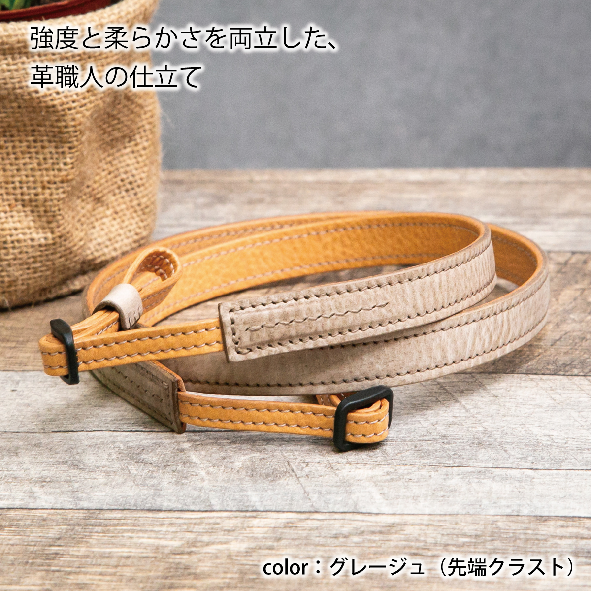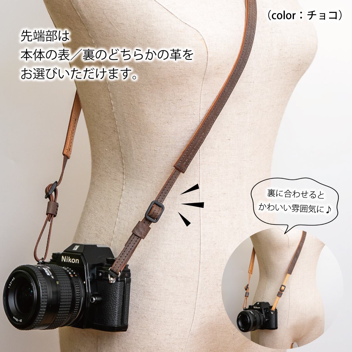 両面に革を貼り合わせているため、一枚革のストラップと比べて丈夫で安心感を感じていただけます。また、床面(革の裏面)が露出しないため、革のカスが服やカメラに付着することもありません。