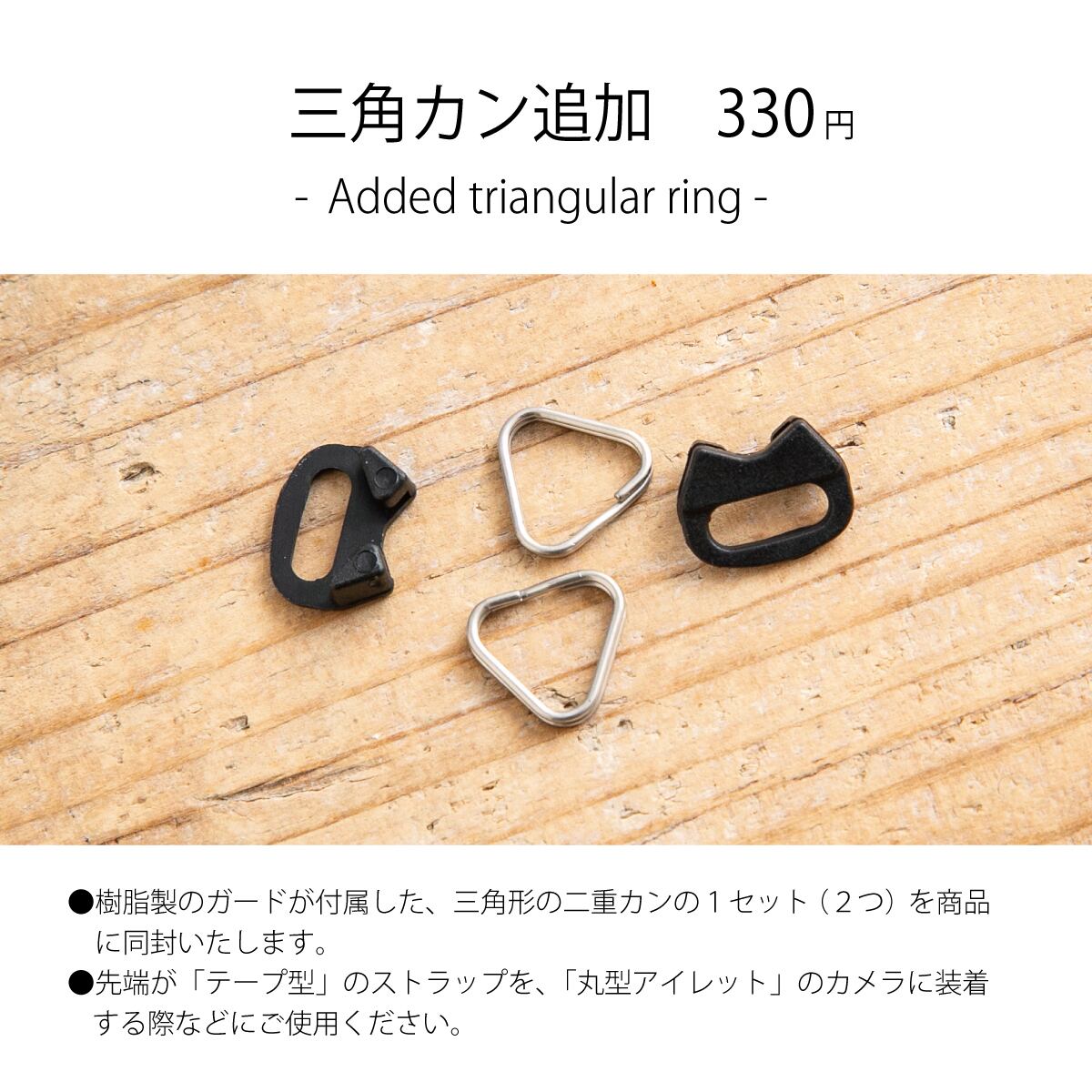 ・三角カンを装着することで、ニコン、オリンパス、ペンタックス、ソニー、ライカなどの「丸穴型アイレット」を備えたカメラにも取り付け可能です。(追加オプションあり)